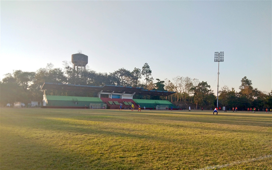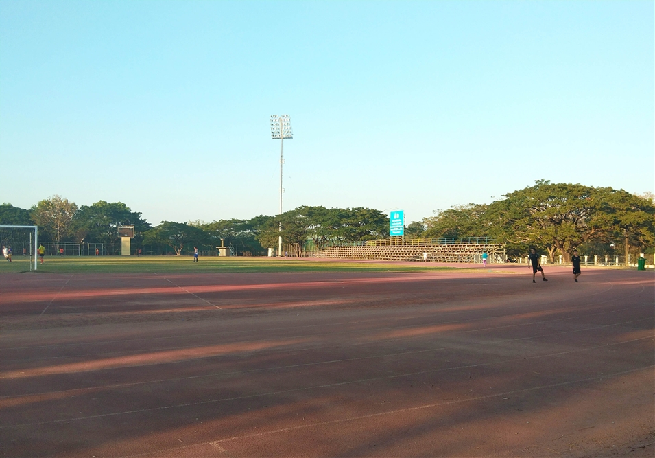 老撾國立大學的同學就很喜歡踢足球,足球場在學校的東面,球場正面是主席臺,側面還設有一處看臺,大約可以容納270名觀眾。跑道一圈也是400米,占地面積很大。球場中間的草是真草,有專門的人員養(yǎng)護。