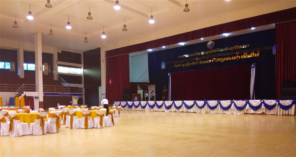 大禮堂在學校行政樓旁邊,很多人在《留學|直擊老撾國立大學入學現(xiàn)場》中看到過。大禮堂內部裝飾得整潔明亮,正中央是舞臺,四周設有看臺,大廳中央也可以擺放一些桌椅,所以一般用于文藝演出和召開大型會議。
