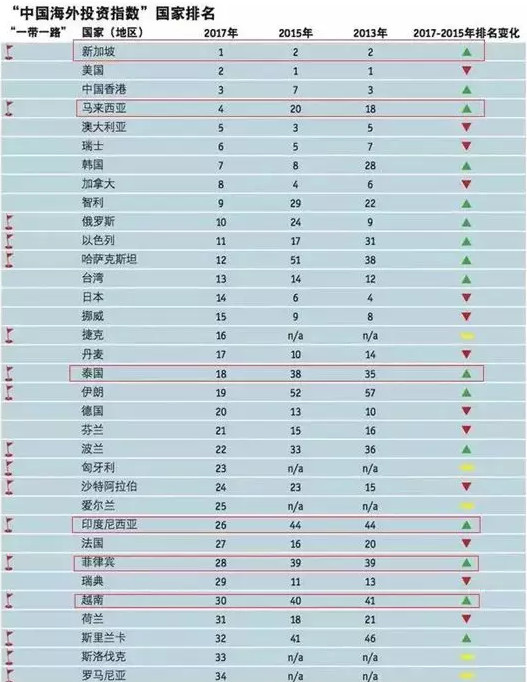 根據(jù)最新發(fā)布的中國(guó)海外投資指數(shù)來看,東盟國(guó)家排名第一。2017年,新加坡超越美國(guó)排名第一。