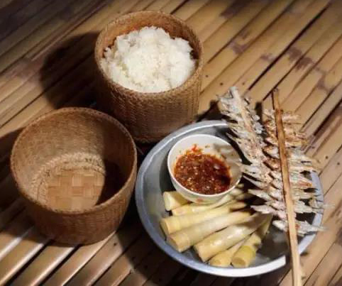 糯米飯是老撾人最愛吃的主食,約占全部食物的70%。老撾糯米飯的做法是:頭天晚上用水浸泡糯米,第二天清晨把米撈在一個(gè)竹編漏斗狀有蓋的容器內(nèi),將其套架在盛水的陶缽口上,燒蒸。這種糯米蒸飯粘性好,軟硬適中,香甜可口。吃飯時(shí),將煮熟的糯米飯盛在一種叫做“迪普考”的竹編小飯簍里。吃時(shí),把飯簍的蓋子打開,抓出一小團(tuán)糯米飯,用手使勁攥、捏,然后蘸著用魚露、辣椒等制作的調(diào)料吃。據(jù)說,飯團(tuán)捏得越緊,吃起來越香。