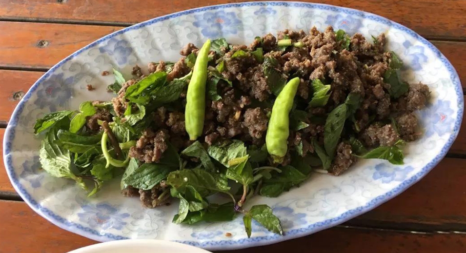 老撾語叫Lahp,老撾最著名的代表菜之一,其做法是將新鮮的雞肉、豬肉、牛肉或魚肉剁碎,拌以魚露、辣椒、鹽、青檸、香茅、薄荷等多種佐料制成,味道鮮美獨(dú)特。這個(gè)特色菜分生、半熟和全熟,點(diǎn)的時(shí)候一定要說清楚,否則對(duì)于吃慣了熟食的人來說很難下咽。