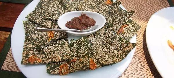 老撾是東南亞唯一的內(nèi)陸國(guó),海產(chǎn)品相對(duì)周邊鄰國(guó)少了很多,可是流經(jīng)老撾的湄公河盛產(chǎn)河苔,是一道著名的下酒菜。這道菜的老撾名叫Khai Paen,將河苔片下油鍋炸至酥脆后撒上芝麻,搭配檸檬草、花生、蘸醬等一起吃,味道極其鮮美。