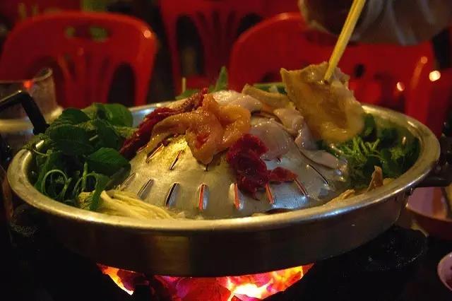 老式火鍋為涮烤兩吃,跟中式火鍋還是有很大區(qū)別的?;疱伒男螤罡褚粋€(gè)有沿兒的平底鍋,中間高高鼓起,可用于燒烤,周圍盛湯用于涮煮,還有大廚現(xiàn)場(chǎng)烤制的大蝦、生蠔、牛肉串等食物,配上一瓶老撾啤酒,盡享美食。