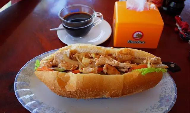 老撾語叫khao ji,之所以在老撾如此常見是跟法國(guó)的殖民歷史密切相關(guān),無論是餐廳還是路邊攤,法棍隨處可見,游客們最愛的還是將法棍面包切成兩半后夾入一些雞肉、牛肉、火腿、豬肉、雞蛋、蔬菜等不同餡料和醬料,制成三明治,既美味又實(shí)惠。