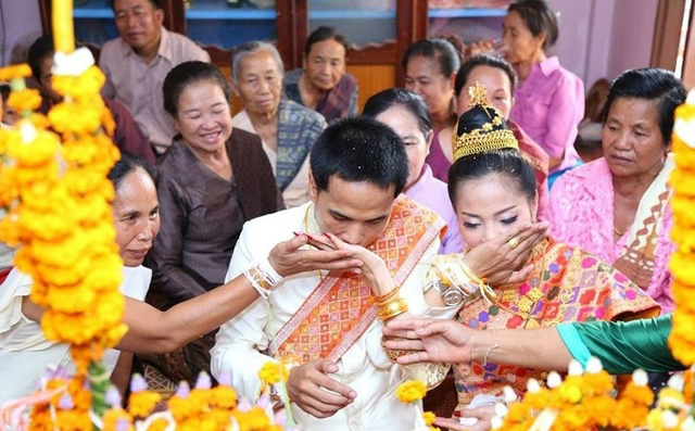 感恩儀式是婚禮上一項重要程序,過程也非常復雜,新郎新娘要感謝雙方父母養(yǎng)育之恩,雙方家長要宣講老撾的“十二風”、“十四俗”,強調(diào)夫妻互敬之德,提醒雙方尊敬老人。