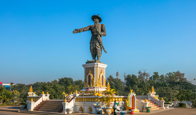 湄公河邊上有一片很大的綠地公園,叫湄公河邊公園。公園里有一尊國(guó)王Chao Anouvong的雕像,面朝泰國(guó),似乎在向泰國(guó)討伐失去的土地。