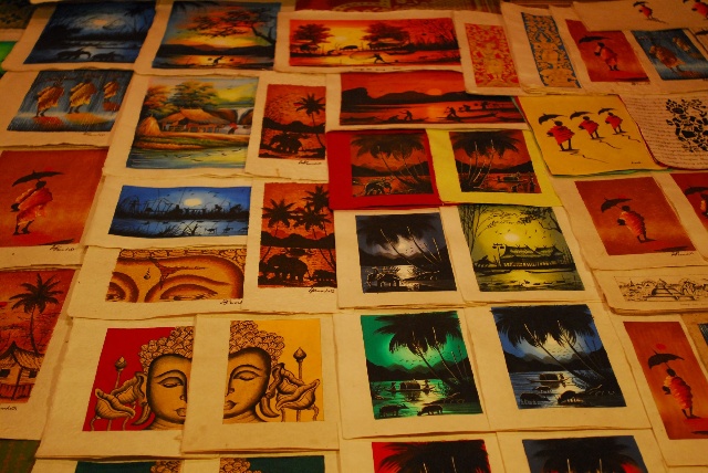 老撾原生態(tài)的手工藝造紙非常有名,也是在市場(chǎng)上最常見(jiàn)的一種工藝品,包括紙畫、紙燈罩、名信片、筆記本等種類。這種紙質(zhì)藝術(shù)品的繪畫內(nèi)容多與佛教有關(guān),極具老撾特色。