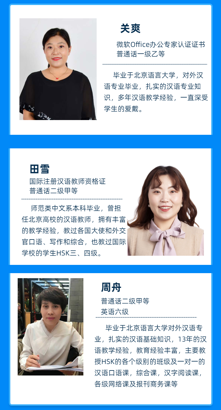 金沛漢語學院擁有雄厚師資力量和優(yōu)秀的教師團隊,中國名校名師在線課堂,扎實的專業(yè)知識、漢語考試技巧、方向,根據學生目標,制定適合的教學計劃,助你順利過關!