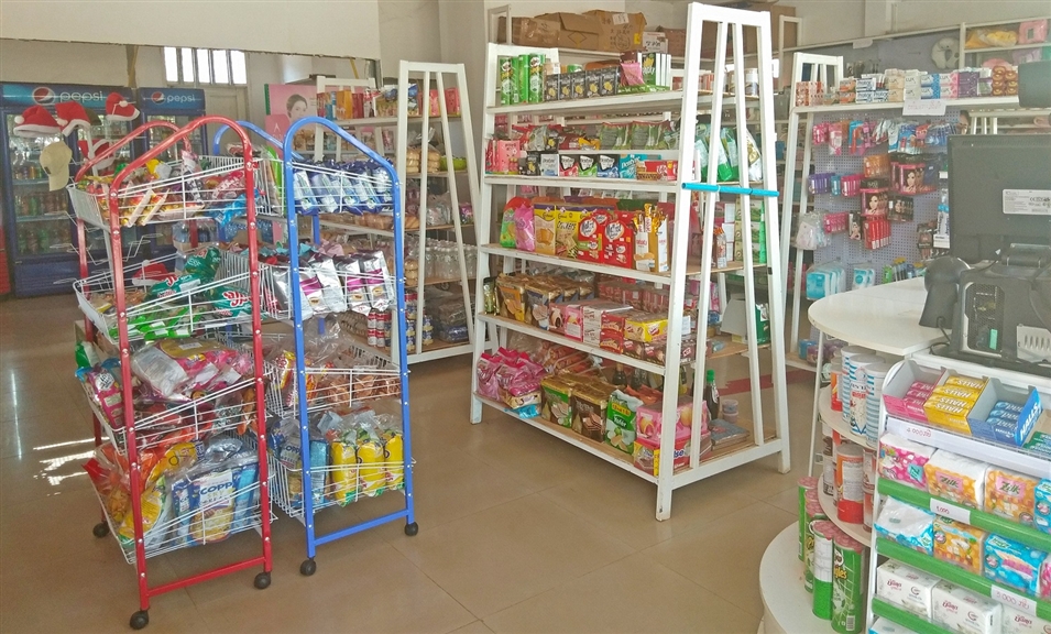 小商店都有一個(gè)特點(diǎn)——“麻雀雖小,五臟俱全”。宿舍區(qū)小商店面積大概55平米,里面整齊排放著幾排貨架,各種商品琳瑯滿目。