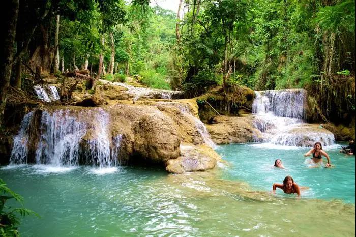 這里是一座寬廣的多層瀑布,瀑布總高100米,瀑布從石灰石山峰傾瀉而下,注入下面一系列清涼、翠綠色的水潭中。三層瀑布傾瀉而下,形成多個(gè)泛著藍(lán)綠色光澤的水潭,這里的景色像極了九寨溝的五彩池。陽(yáng)光透過樹葉的間隙灑在涓涓溪流中,溪面就好像是一片片破碎的鏡子,點(diǎn)點(diǎn)地閃爍魚鱗般的光,如夢(mèng)似幻,讓人迷醉。在這里最熱門的活動(dòng)莫過于大樹繩索跳水,在水潭內(nèi)嬉戲不要著急上岸,可以安靜的在水里享受一下純天然免費(fèi)小魚SPA。