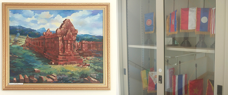 二樓樓梯拐角處掛著老撾古老寺廟油畫,旁邊的柜子里整齊擺放著幾排各國國旗;三樓樓梯拐角處掛的則是川壙省石缸平原油畫,充滿了藝術(shù)氛圍。