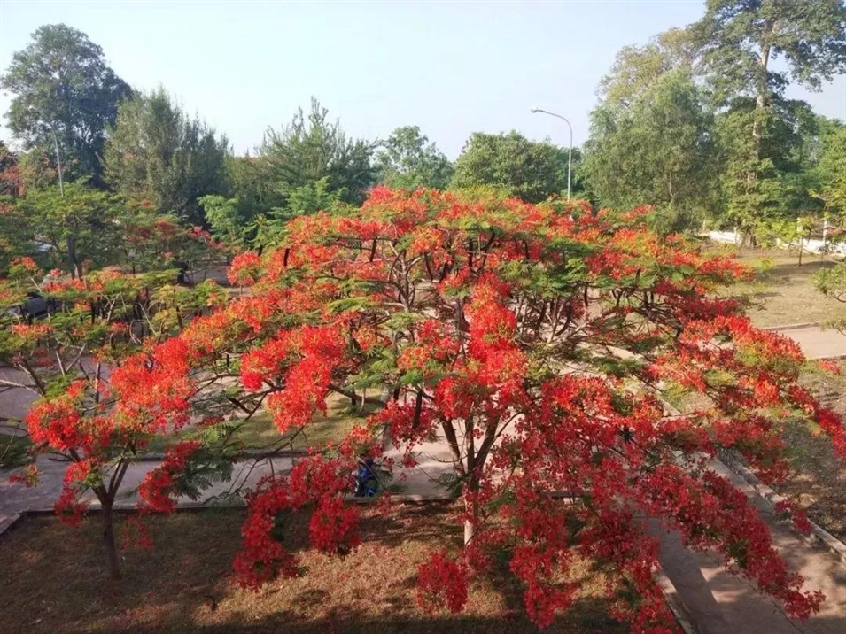 宿舍區(qū)有一片小森林,午后或者晚間,可以跟朋友一起散步,特別是炎熱的夏季,感受習(xí)習(xí)涼風(fēng),整個(gè)人神清氣爽,四月的宿舍樓下環(huán)境很迷人的,樹(shù)木長(zhǎng)滿了紅花,就像火熱的天氣,好像在宣告著:夏天來(lái)了