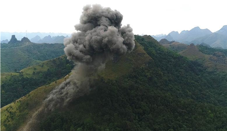 掃雷隊在中越邊境廣西段某雷場引爆炸藥,以清除雷場植被,方便后期搜排